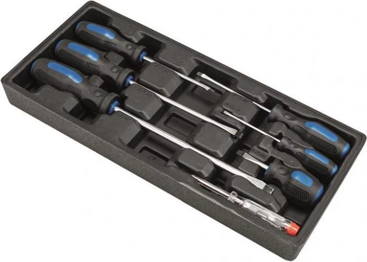 6 sleufschroevendraaiers: 1 spanningzoeker, 4×100, 5×100, 3×75, 6×150, 6×38, 8×200