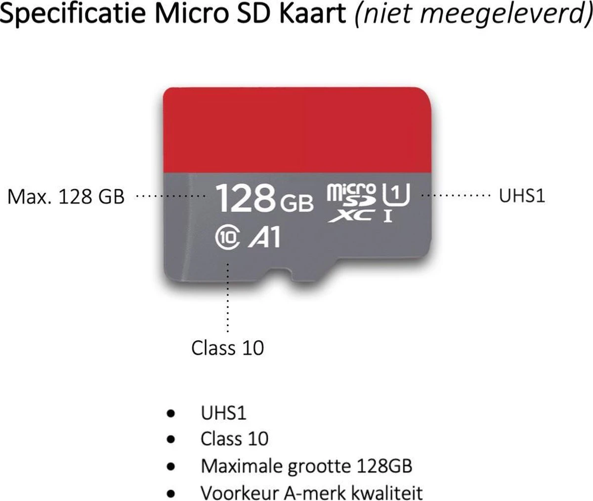 De camera is voorzien van een bewegingsmelder. Hierdoor zal hij wanneer er beweging plaats vindt, deze beelden automatisch opnemen op de micro SD-kaart. Deze micro SD-kaart wordt niet meegeleverd, je kunt hiervoor een standaard micro SD-kaart gebruiken. De voorwaarden waaraan deze moet voldoen zijn maximaal 128GB, UHS1 en Class10. Gebruik bij voorkeur een A merk micro sd kaart.