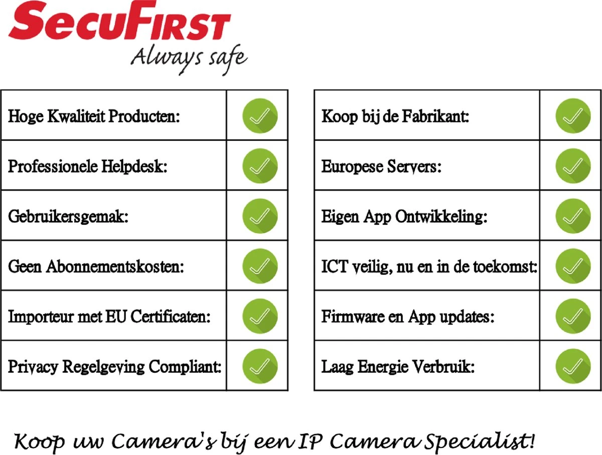 - Uit te breiden met alle producten van het merk SecuFirst in dezelfde app. Of dit nu een IP camera is, verlichtingscamera of mini alarm systeem, dat maakt niet uit.