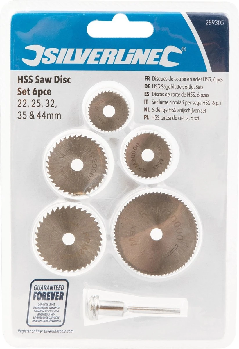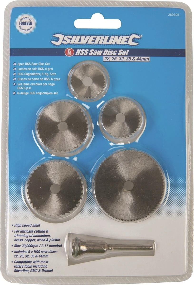 HSS. Voor het nauwkeurig zagen en trimmen van aluminium, messing, koper, hout en plastic. Maximaal 20.000 min-1/3.17 mm ashals. Inclusief 5 × HSS schijven: 22, 25, 32, 35 en 44 mm compatibel met de meeste hobbymachines, waaronder die van silverline, gMC en dremel