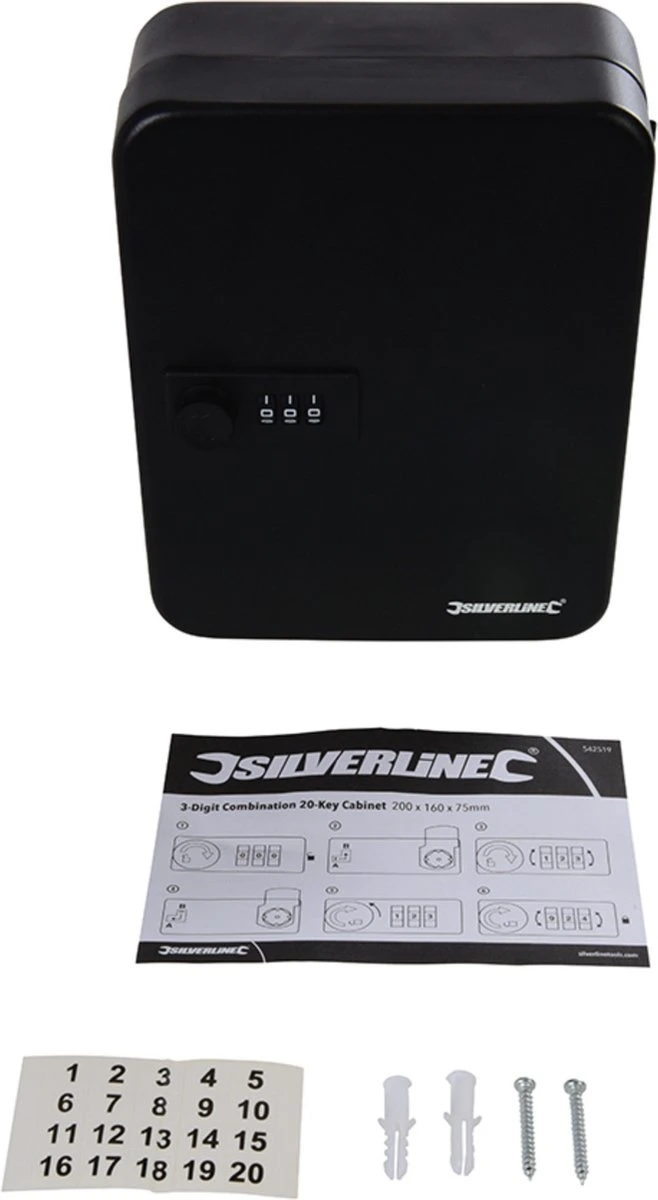 Heavy-Duty stalen constructie met poedercoating. Gemakkelijk te resetten 3-cijferige combinatie. Voor het veilig opbergen van 20 sleutels. Inclusief muurbevestigingsmiddelen en genummerde labels
