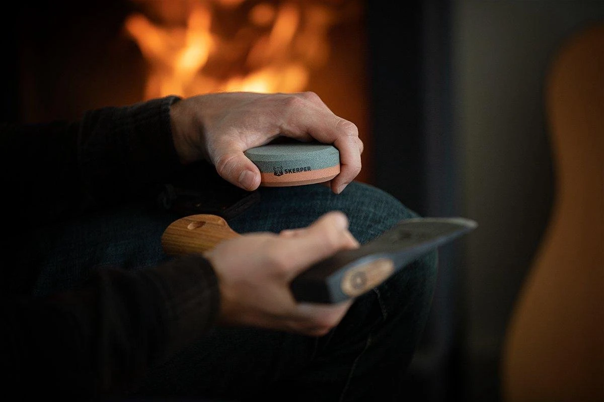 * Deze Skerper Axe Sharpener is een ronde slijpsteen die je gemakkelijk in de hand houdt. Bij groot gereedschap slijp je door de steen langs het gereedschap te halen i.p.v. andersom.