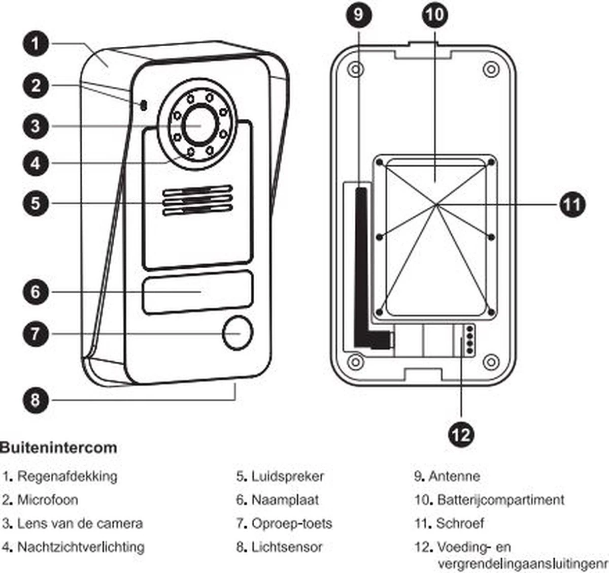 Buitenunit met naamplaatje, beldrukker en camera, draagbare binnenunit met 3,5” TFT kleurenmonitor, adapter, batterijen, pluggen en schroeven