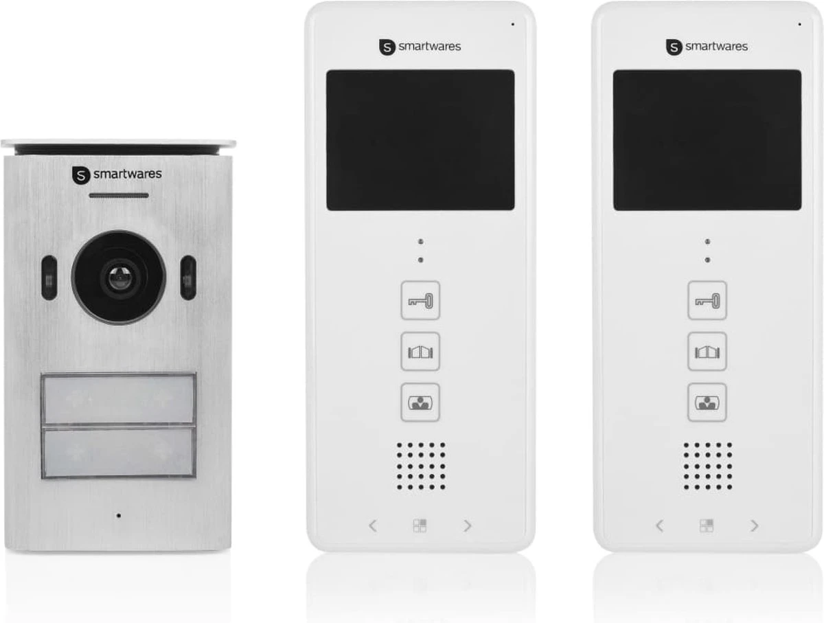 Weet wie er voor je deur staat door bezoekers te zien en te spreken voordat je de deur opent met de Smartwares DIC-22122 Video Intercom Systeem. Het video intercom systeem bevat een buitenunit van geborsteld aluminium en twee binnenschermen met LCD monitor. De gemakkelijke 2-draadse installatie zorgt ervoor dat de intercom met vrijwel iedere huidige deurbelbedrading gebruikt kan worden.Weet wie er aanbelt