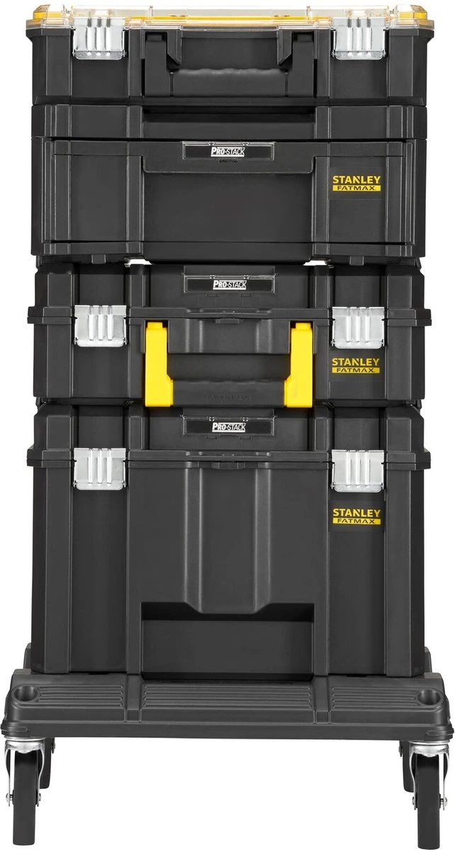 STANLEY biedt een compleet assortiment kwaliteitsopbergsystemen voor de doe-het-zelver en de professionele gebruiker. Ontdek het gamma van duurzame harde koffers tot stevige gereedschapstassen. PRO-STACK modulaire opbergkoffers en organisers bieden een oplossing op maat. Deze set beschikt over 4 verschillende soorten gereedschapskoffers op een wagentje met draaibare wieltjes.