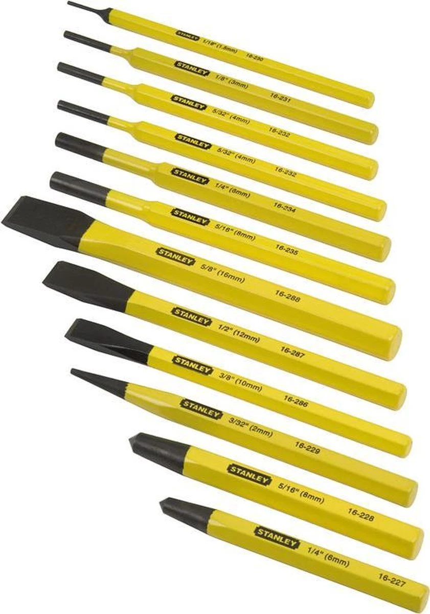 Deze STANLEY koudbeitels en drevels zijn van chroom-vanadium staal en uit één stuk gevormd voor sterkte en duurzaamheid. Doordat ze gehard en getemperd zijn, hebben ze een verlengde levensduur en zijn ze ook veiliger. Met een poederlak afwerking wordt de zichtbaarheid verhoogd. Deze set bestaat uit 12 koudbeitels en drevels.