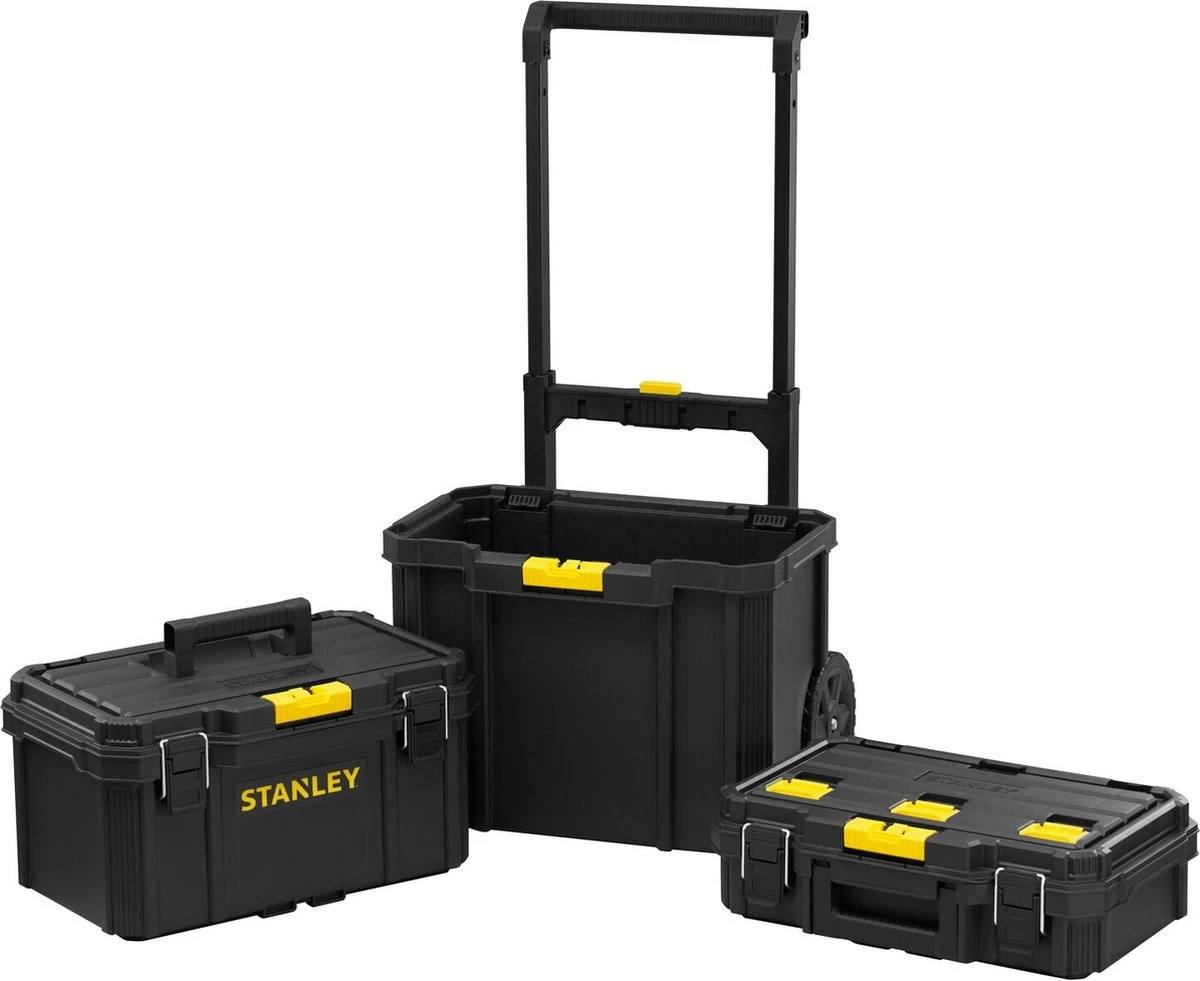 - Modulaire gereedschapswagen met een lage gereedschapskoffer, een hoge gereedschapskoffer met uitneembare gereedschapsbak en een ruime open gereedschapsbak