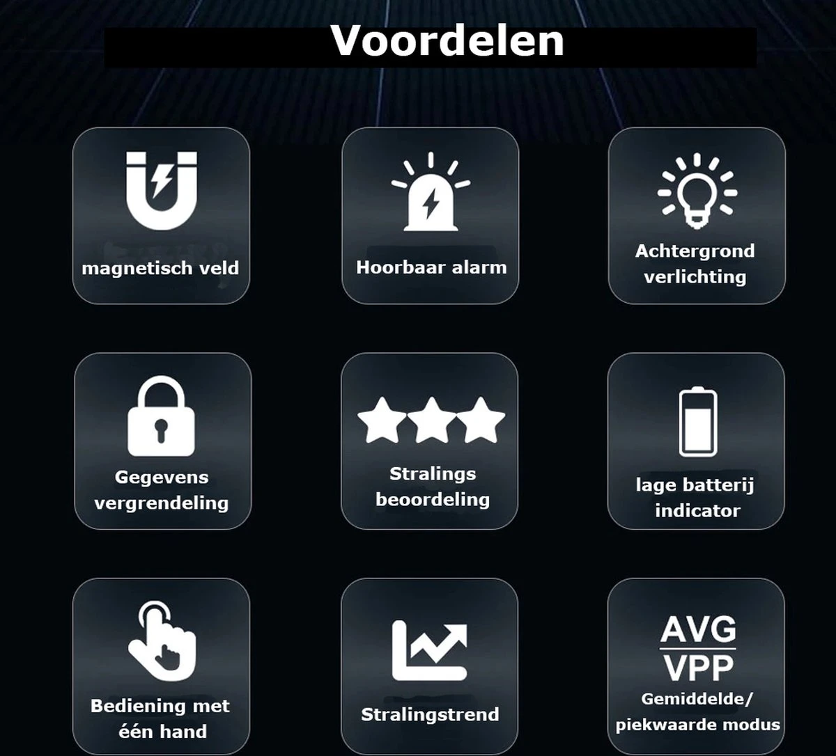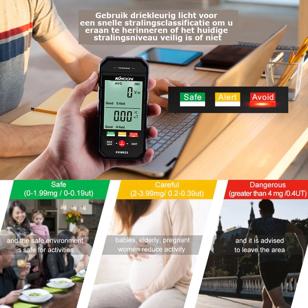 Stralingsdetector is een veilige en gebruiksvriendelijke tool die elektromagnetische velden detecteert. Deze detector heeft een hoge mate van nauwkeurigheid en kan worden gebruikt om zowel elektrische als magnetische velden te detecteren. Het apparaat is perfect voor mensen die zich zorgen maken over de mogelijke gezondheidsrisico & van elektromagnetische velden.