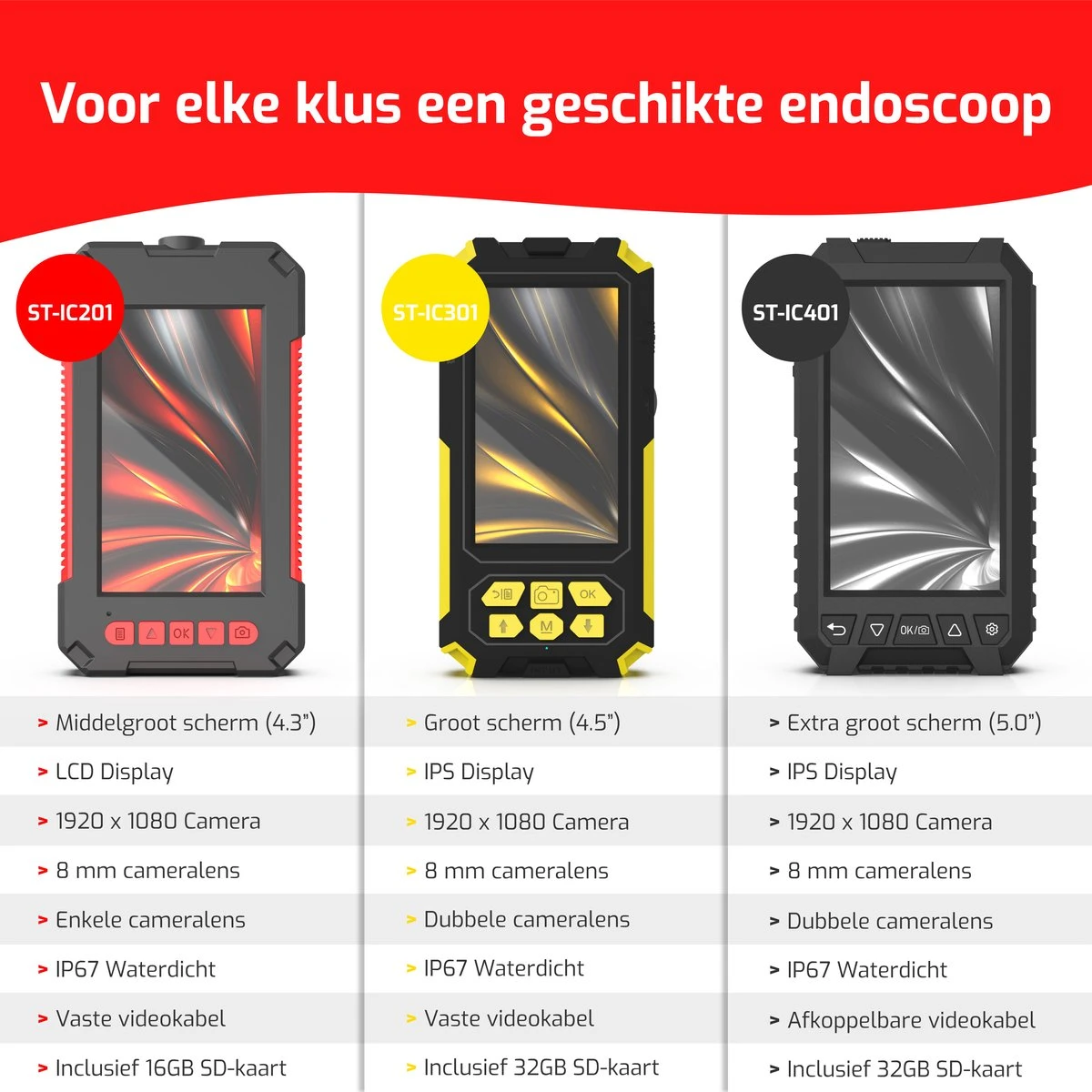Ontdek het endoscoop assortiment van STURMM® en inspecteer moeilijk bereikbare plekken met één van onze hoog beoordeelde inspectiecamera’s. Model ST-IC201 is een multifunctionele endoscoop en geschikt voor een divers aantal inspectieklussen. Deze inspectiecamera is uitgerust met een hoogwaardige videokabel van 5 meter, HD camera en 4.3 Inch display. De endoscoop wordt geleverd met een gratis 16GB SD kaart voor het vastleggen van al uw beeldmateriaal.