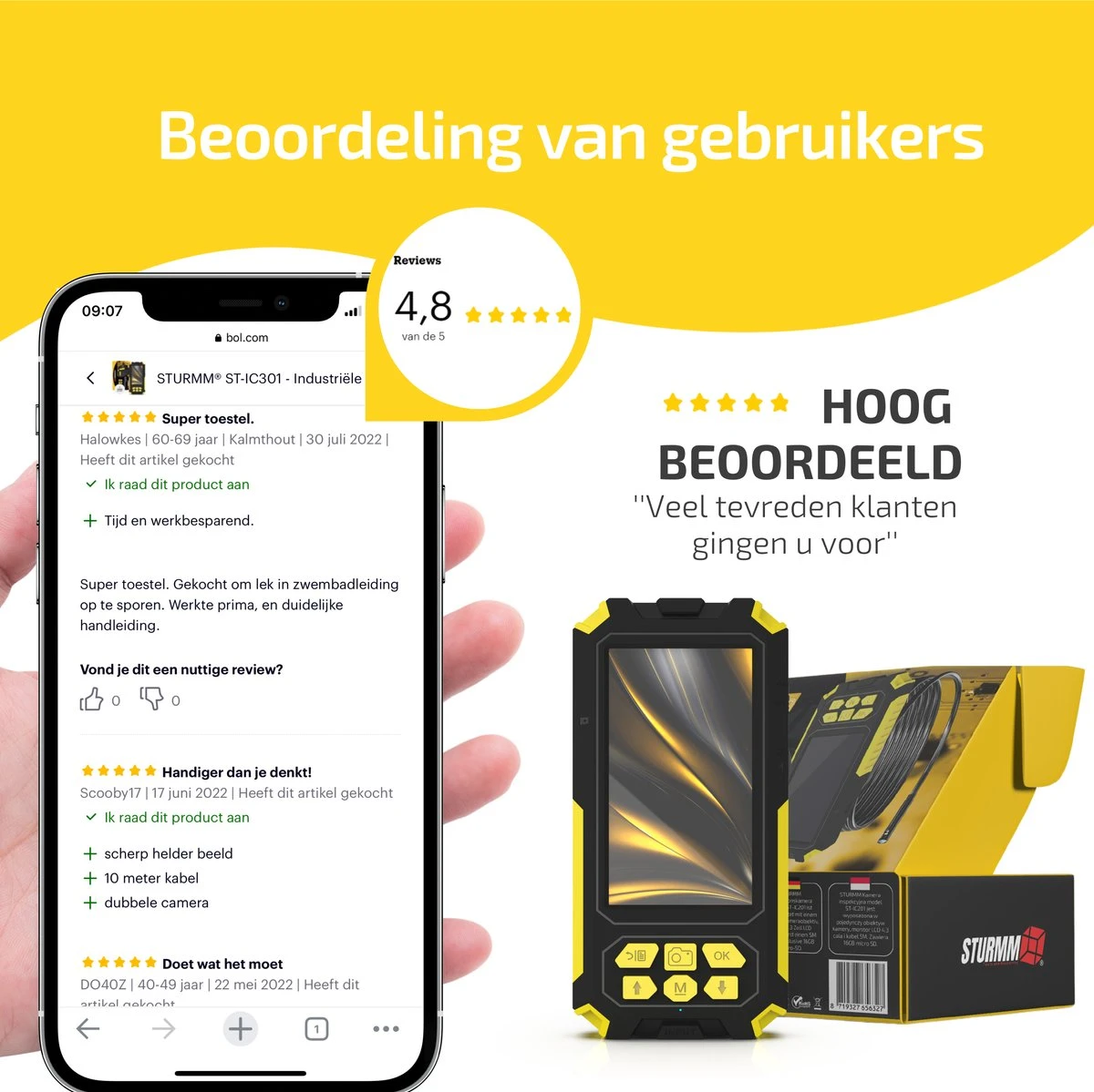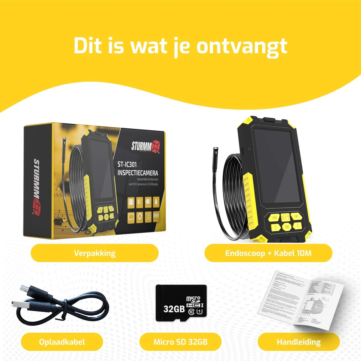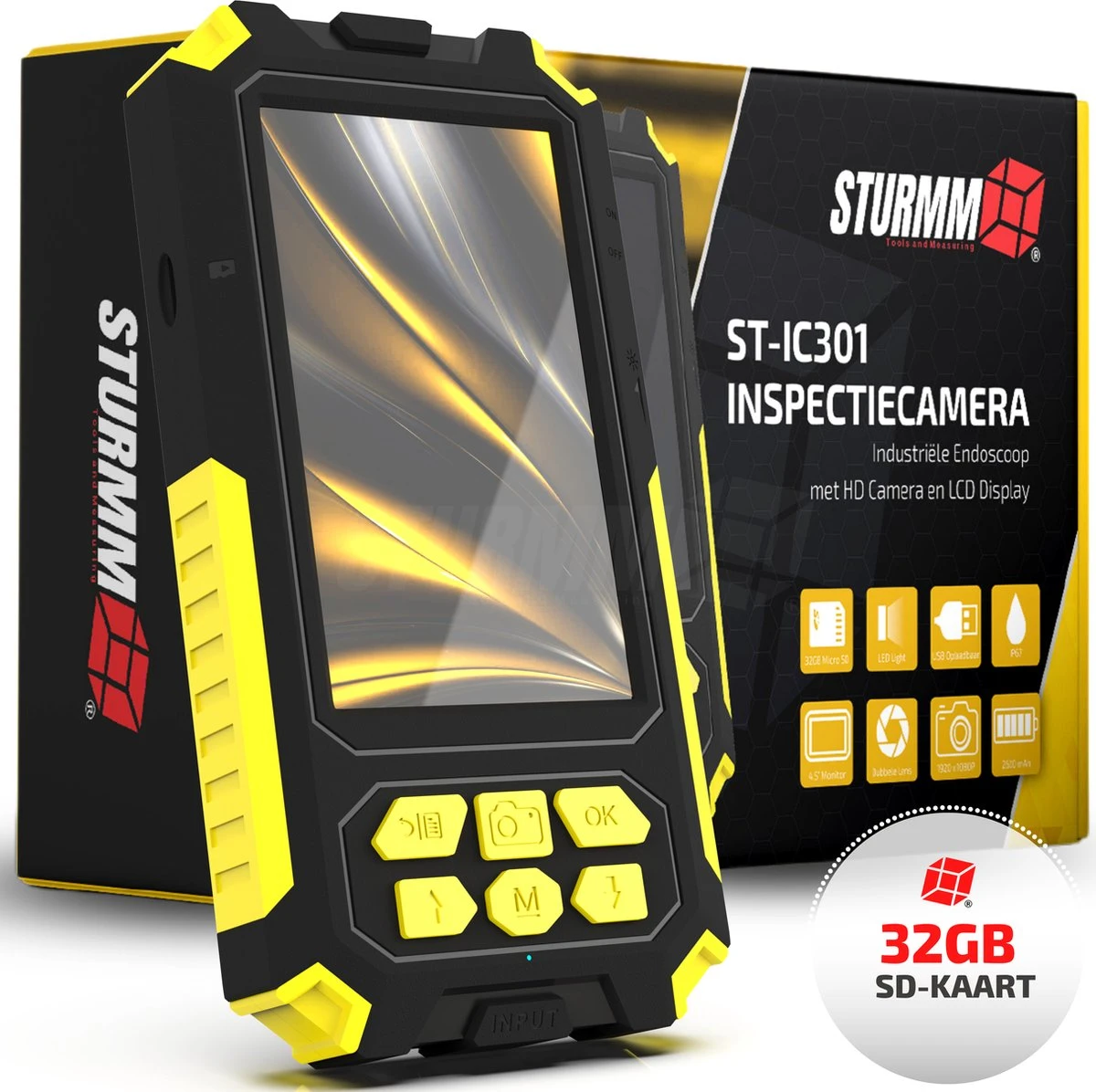 Ontdek het endoscoop assortiment van STURMM® en inspecteer moeilijk bereikbare plekken met één van onze hoog beoordeelde inspectiecamera’s. Model ST-IC301 is een van de meest geavanceerde modellen en geschikt voor zowel zelfstandige als professionele inspectieklussen. Deze inspectiecamera is uitgerust met een hoogwaardige, extra lange videokabel van 10 meter, twee HD camera’s en een 4.5 Inch IPS display. De endoscoop wordt geleverd met een gratis 32GB SD kaart voor het vastleggen van al uw beeldmateriaal.