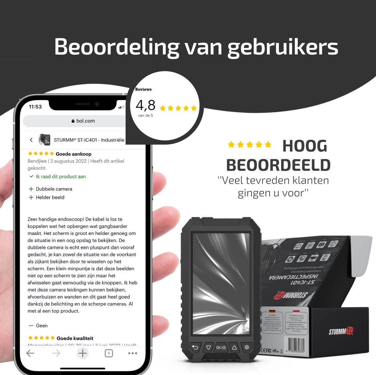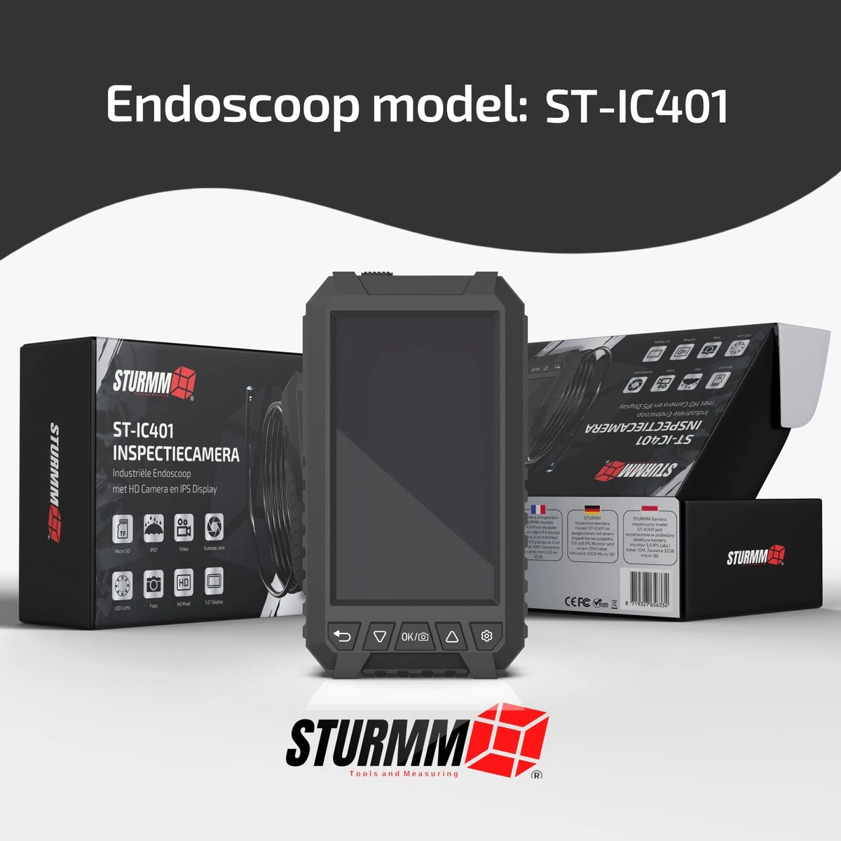 Ontdek het endoscoop assortiment van STURMM® en inspecteer moeilijk bereikbare plekken met één van onze hoog beoordeelde inspectiecamera’s. Model ST-IC401 heeft een modern design en is dankzij de geavanceerde uitvoering geschikt voor zowel zelfstandige als professionele inspectieklussen. Deze inspectiecamera is uitgerust met een hoogwaardige, extra lange afkoppelbare videokabel van 10 meter, twee HD camera’s en een 5.0 Inch IPS display. De endoscoop wordt geleverd met een gratis 32GB SD kaart voor het vastleggen van al uw beeldmateriaal.