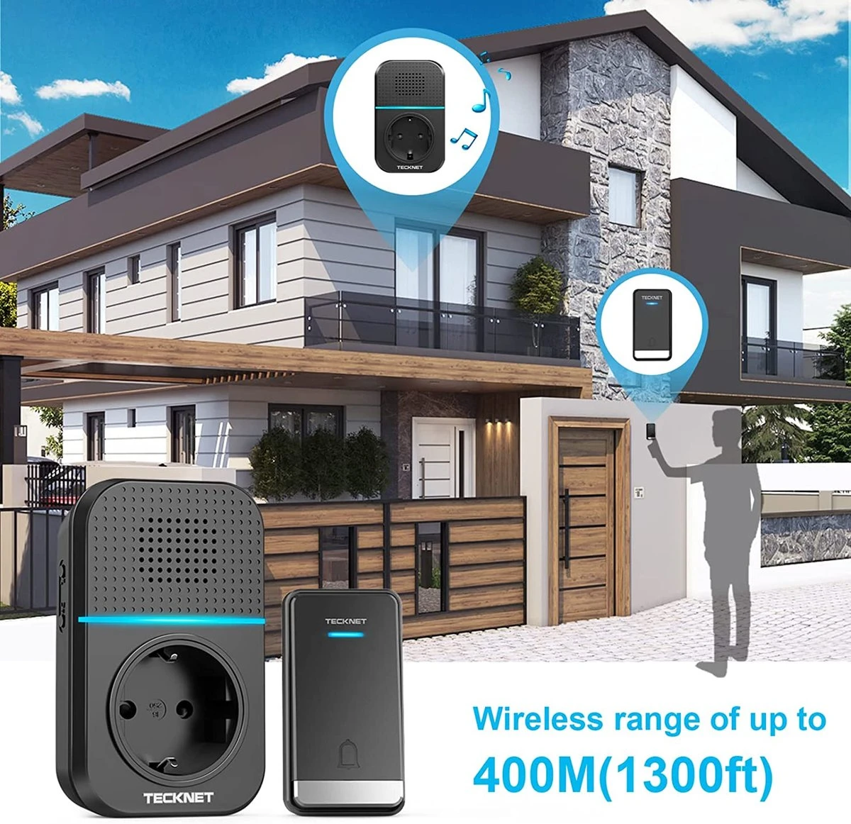 - 150 meter bereik: Voldoende radiobereik om de radiodeurbel overal in uw huis te installeren.