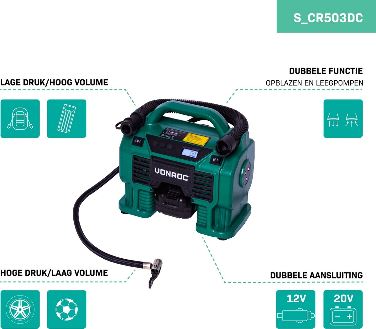 Deze multifunctionele compressor van VONROC heeft een dubbele functie. Functie 1 is voorzien van een hoge druk en laag volume voor het oppompen van allerlei banden en ballen. Functie 2 is voorzien van een hoog volume en lage druk voor het oppompen én leeg laten lopen van verschillende opblaasbare artikelen, zoals een opblaasbaar zwembad. Na levering kun jij direct aan de slag, de compressor wordt namelijk geleverd inclusief een 2.0Ah accu en een sneloplader.