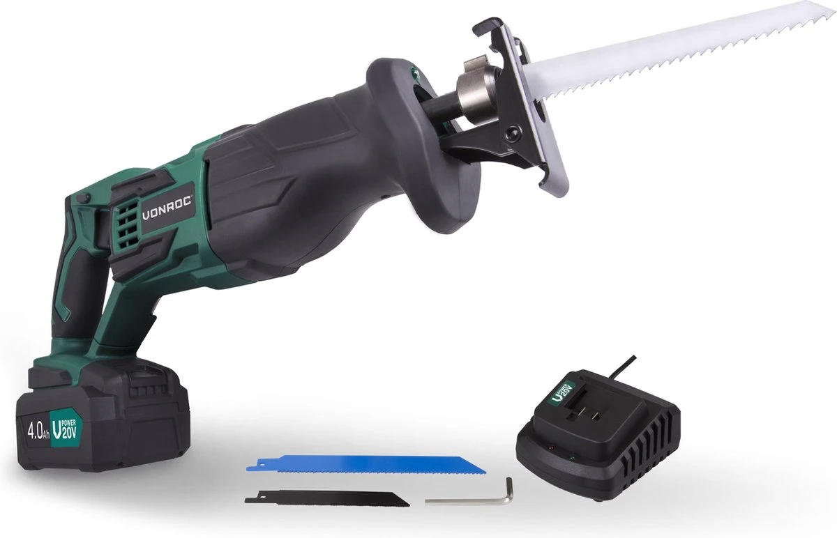 Deze complete set bevat een accu reciprozaag, een 20V 4.0Ah accu, een sneloplader, 1 zaagblad voor hout, 1 zaagblad voor metaal en een handige opbergtas. Deze 20V reciprozaag is onderdeel uit het VONROC VPower 20V accuplatform.