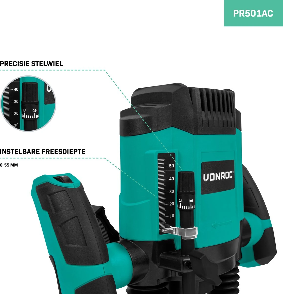 Voor maximaal werkplezier heeft VONROC de bovenfrees uitgerust met maximaal gemak. Dankzij twee grote ergonomisch vormgegeven handvaten – met soft grip – kun je comfortabel en langdurig werken. De platte bovenkant van de behuizing maakt het wisselen van freesbits heel gemakkelijk doordat je de machine stevig op een oppervlak kunt plaatsen. Een kunststof bodemplaat zorgt ervoor dat je krasvrij werkt. Bovendien zorgt een stofzuigeraansluiting ervoor dat je ook stofvrij kunt werken. Een soepele – topkwaliteit – rubberen kabel van maar liefst 3 meter geeft je veel bewegingsvrijheid.
