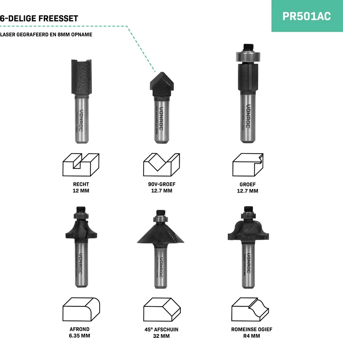 VONROC biedt ook een zeer uitgebreide freesset in een luxe houten koffer. Zo kun jij je bovenfrees optimaal benutten. Bekijk snel de Luxe freesset (PR801AA)