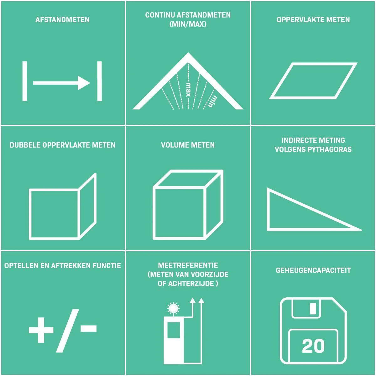 De laser afstandsmeter heeft een bereik tot 40 meter en meet afstanden (m1), oppervlakten(m2) en volumes (m3). Door de Pythagoras functie kun je indirect de hoogte of lengte meten. Bijvoorbeeld de hoogte van een gebouw. Dit kan door de diagonale afstand vanaf het apparaat naar het hoogste punt te meten, vervolgens meet je de afstand vanaf het apparaat horizontaal naar het laagste punt.