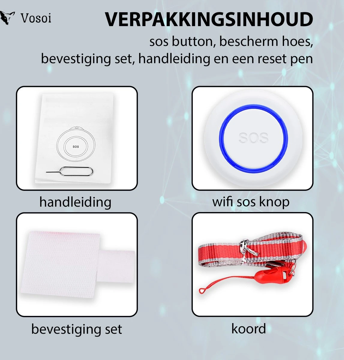 De Vosoi SOS paniekknop is een apparaat die familie en vrienden bij zich kunnen dragen met het gebruik van het draagkoort of ergens kunnen bevestigen met het bevestigingsmateriaal wat er bij geleverd word. Dit alarm kan gebruikt worden in elk vorm van gevaar voor een persoon. Dit biedt toch een extra veilig gevoel voor de personen die de Vosoi SOS knop hebben of bij zich dragen dat ze altijd gehoord worden.