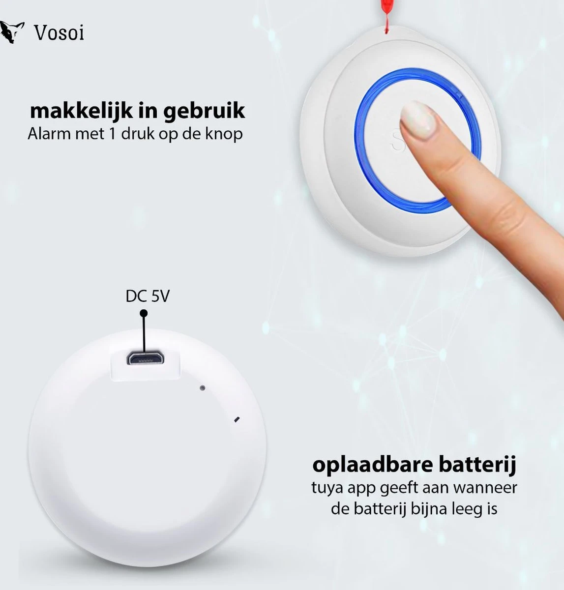 - Help met één Vosoi noodknop ongelukken te voorkomen, de verbonden gebruikers ontvangen de alarmmelding op smartphone