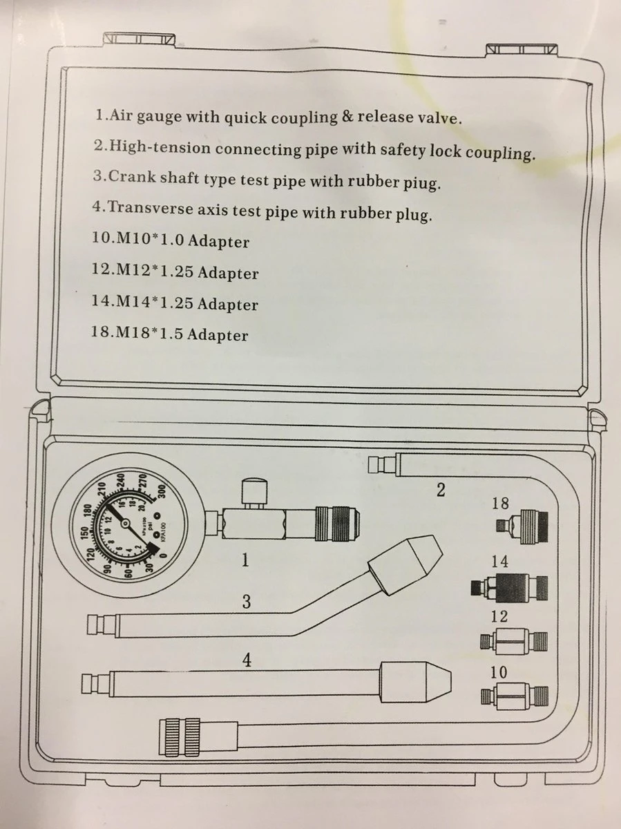 Weber Tools compressiemeter voor benzinemotoren voorzien van verschillende adapters.