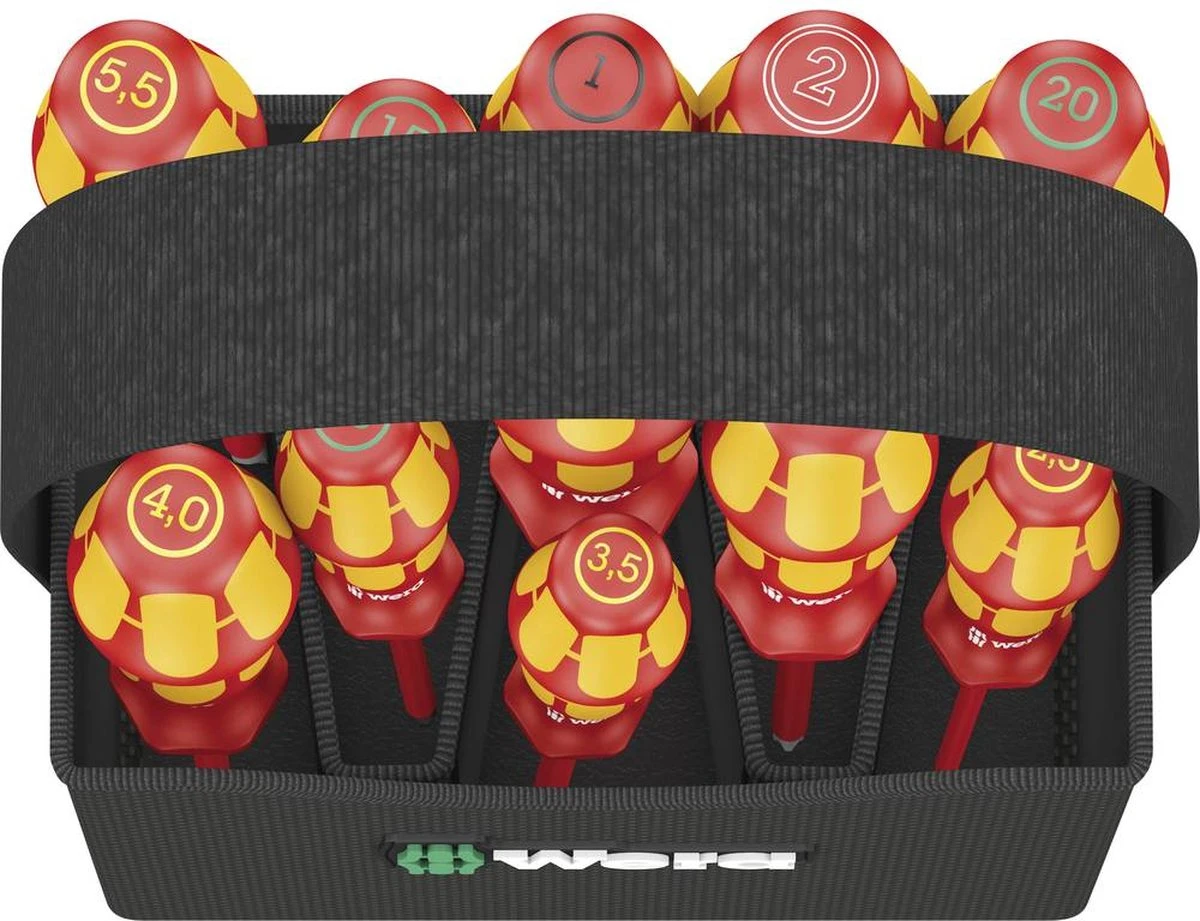 11 VDE geïsoleerde Kraftform schroevendraaiers met ‘Take it Easy’ gereedschapszoeker in vormvaste Wera 2go 4 kokers. Met instelbare ruimte-indeling voor individuele aanpassing.