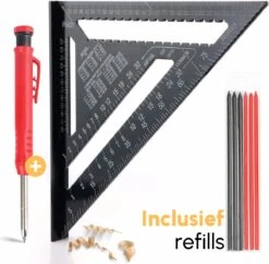 Van lijnen trekken als aftekenhulp tot zaag begeleiding tot meethulp voor hoeken meten en meer. Dit universele stukje gereedschap helpt je een heel stuk verder in je project. De Speed square is een stevige aluminium winkelhaak waardoor je er een lange tijd grof gebruik van kunt maken.