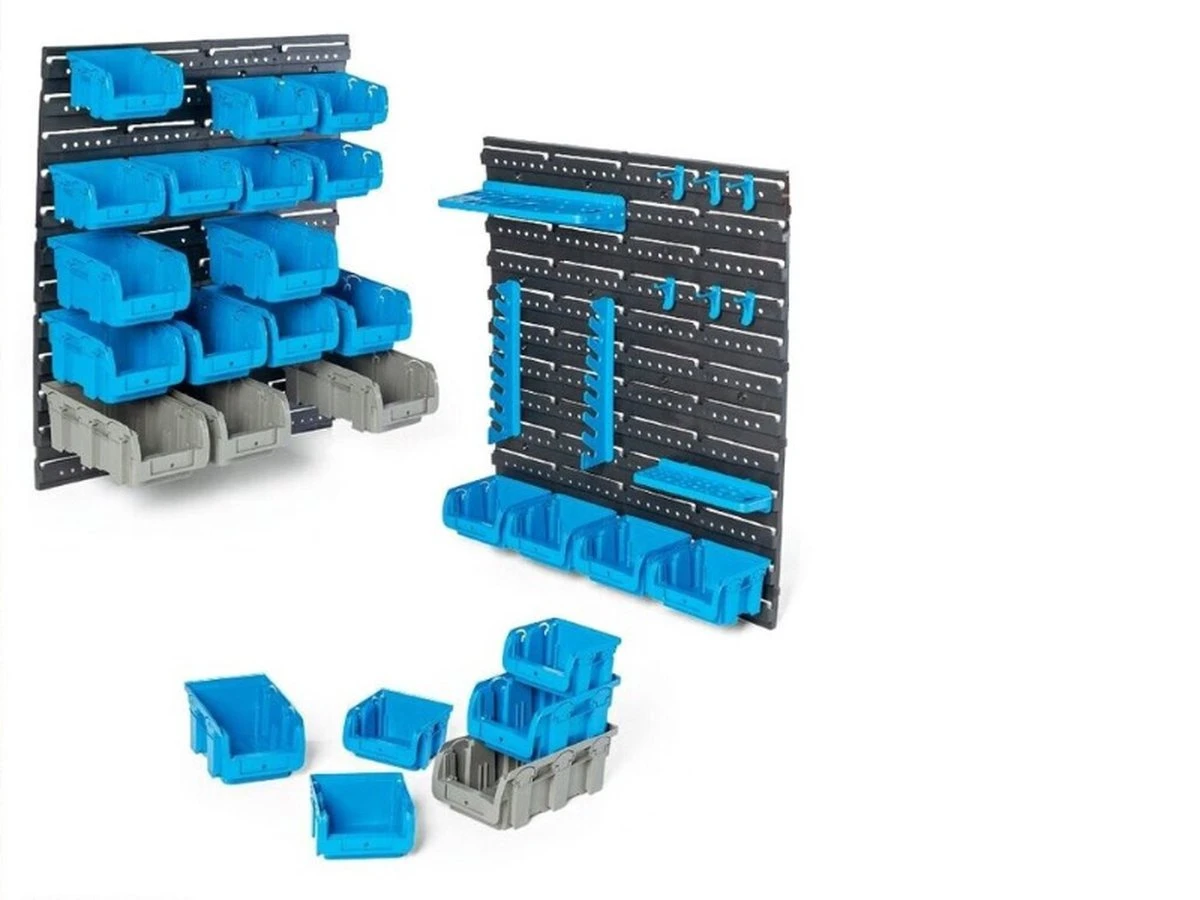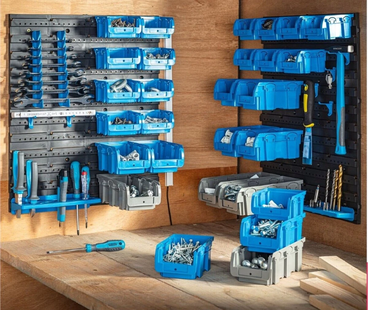 De 43-delige set bestaat uit een gereedschapsbord, bakjes, gereedschapshaken en gereedschapshouders. Alles gestructureerrd en op orde in de werkplaats. Eindeloos uitbreidbaar wandsysteem.