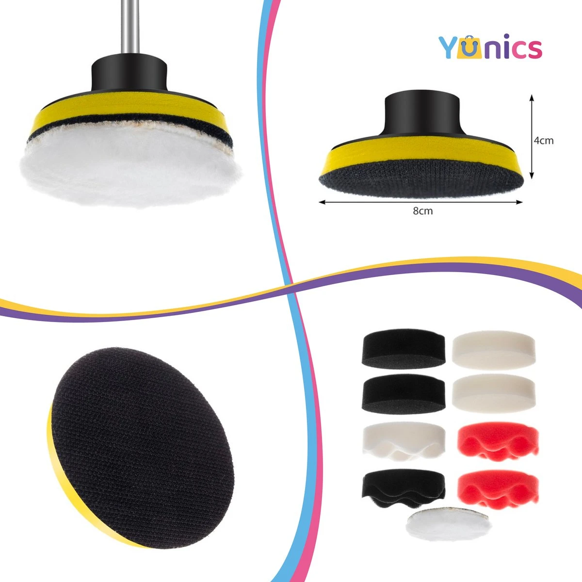 De hele set heeft maar liefst 12 elementen voor het polijsten van verfcoatings en andere elementen die kunnen worden gepolijst: 9 polijstsponzen, polijstvacht, klittenbandkop en een M10-adapter met een 8 mm doorn.